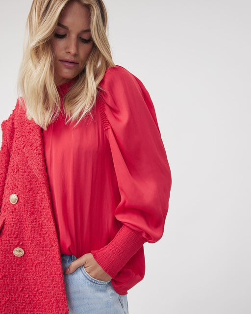 This vibrant red shirt from Decjuba features elastic sleeves and gathered shoulders, offering both comfort and a flattering fit. Its stylish design makes it a versatile addition to your wardrobe, perfect for elevating everyday looks with a touch of effortless elegance.