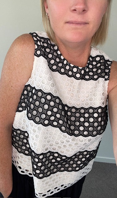 Elevate your wardrobe with our stunning Marcs stripe brocade top! Crafted with luxurious brocade fabric, this black and white crop top features a convenient zip at the back. Perfectly blending sophistication and style, this top will be sure to elevate any outfit. Add it to your collection today!